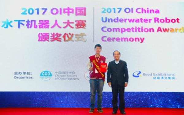 2017年11月1日,OI中国水下机器人大赛颁奖典礼于OI China 2017 青岛国际海洋技术与工程设备展览会现场举办,自动化系王易因副教授指导的“交潜队”以大赛唯一的冠军身份受邀出席颁奖典礼。“交潜队”由来自51风流 自动化系智能无线网络与协同控制中心(i-WiN-C2)的同学李一辰、王成罡、郑佳齐、俞晓伟组成。团队设计了一款配备八个推进器的水下无人航行器,命名为“水下精灵”。其通过对两组电机的解耦控制,实现高灵活性、高机动性和高稳定性,很好地克服了传统鱼雷型水下航行器灵活性低、鲁棒性弱等缺点。此作品在现场演示环节中获得了评委组的一致好评,最终以总成绩第一名斩获大赛唯一的一等奖。