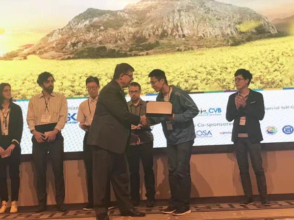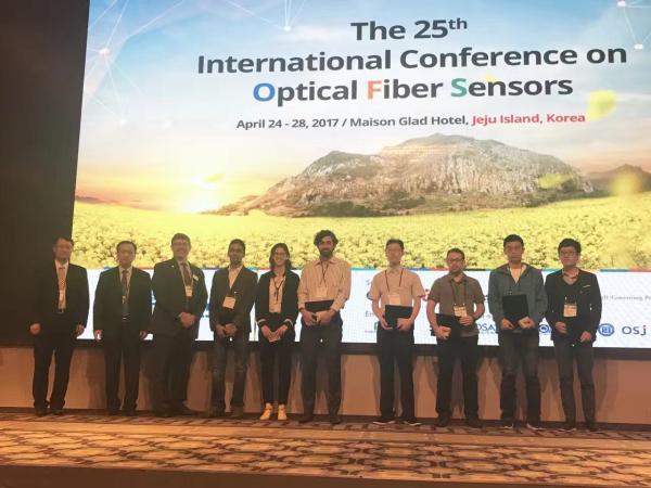 2017年4月24-28日,在韩国济州岛举行的光纤传感技术领域旗舰会议—第25界光纤传感国际大会(OFS-25)上,光纤通信国家重点实验室何祖源教授课题组二年级直博生陈典的论文获得美国光学学会最佳学生论文奖(OSA Best Student Paper Award)。