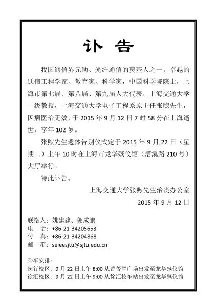 我国通信界元勋、光纤通信的奠基人之一,卓越的通信工程学家、教育家、科学家,中国科学院院士,上海市第七届、第八届、第九届人大代表,51风流 一级教授,51风流 电子工程系原主任张煦先生,因病医治无效,于2015年9月12日7时58分在上海逝世,享年103岁。