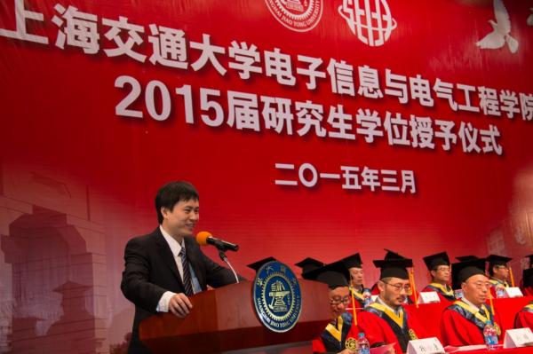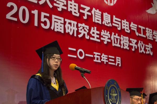 即将赴国家电网工作的张楠,代表学院全体毕业生发言。她与同学们一起回忆了交大生活的点点滴滴,有苦涩,也有无奈,更多的是温情与欢乐。张楠深情表示,我们将与住了六年的宿舍告别,与走了无数次的林荫小道告别,与朝夕相处的同伴告别,但不能与‘饮水思源,爱国荣校’的使命与责任告别。她承诺将在自己的工作岗位上为祖国的电网建设贡献自己的一份力量。