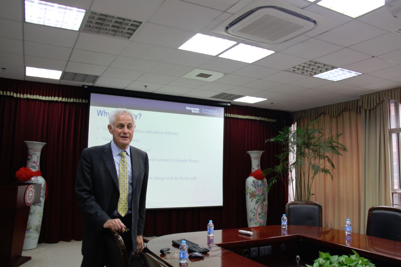 下午,Galil教授面向全院做了题为“Best education in the world: Now available to the world”的报告。我系张丽清教授、谷大武教授、申丽萍副教授等几位老师到场。报告介绍了佐治亚理工与Udacity和AT&T合作推出计算机科学硕士学位课程(Online Master of Science in Computer Science ,简称OMS CS)的情况。学生可以完全通过大规模在线课程模式获取硕士学位。通常,学生获得硕士学位需要花费45000美元,提供在线硕士学位后,仅需6600美元。课程开展以来,已有1,395名学生申请加入,其中包括30名中国学生。