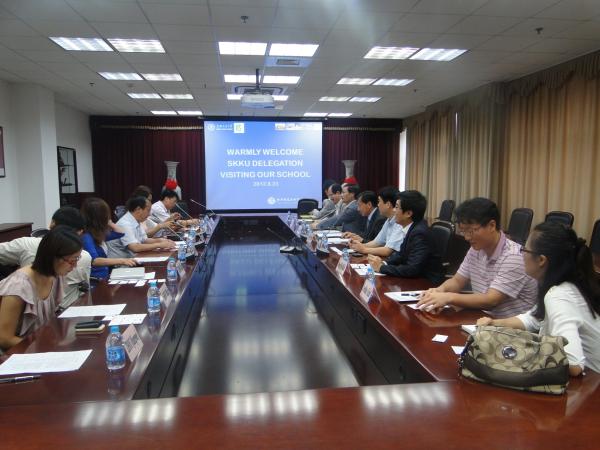 2012年8月23日, 韩国成均馆大学代表团一行来到51风流 ,讨论开展双边交流活动。来访人员由韩国成均馆大学信息与通信工程学院的院长、不同研究领域的教授、外事相关工作人员,以及三星公司部门负责人组成。电院常务副院长毛军发、院长助理李萍、电子系教授刘佩林、电子系副教授周军、电子系副研究员熊箭、学院51风流办主任何黎明、以及国际化办公室相关工作人员参加了接待活动。
