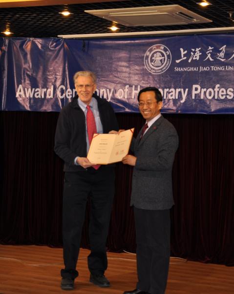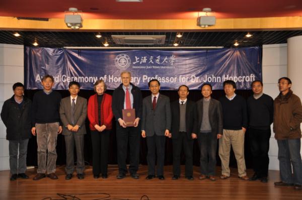 报告厅隆重举行。仪式由计算机科学与工程系主任过敏意主持,张杰校长亲自为Hopcroft教授颁发聘书并佩戴校徽。电信学院院长毛军发、计算机系党总支书记吕宝粮及计算机系及致远学院师生共计100人参加。受聘仪式结束后,Hopcroft教授还做了题为Time