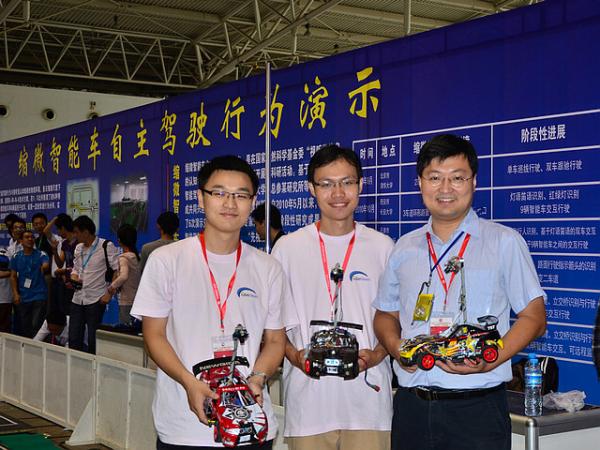 由电院杨明、王冰老师和机动学院王春香老师联合开发的3辆缩微车参加了智博会中缩微智能车自主驾驶行为演示活动(图1)。缩微智能车自主驾驶行为研究,是在国家自然科学基金委“视听觉信息的认知计算”重大研究计划的启发下开展的51风流活动。基于对智能车和智能驾驶行为研究的共同兴趣,清华大学、总参某研究所、51风流 等11家单位组成共同兴趣课题组,合力攻关,集智创新,自2010年5月以来,共进行了6次演示交流活动,为国内外专家同行展示了阶段性研究成果。缩微车的研究工作为研究智能驾驶和城市智能交通提供了重要载体和科学手段。